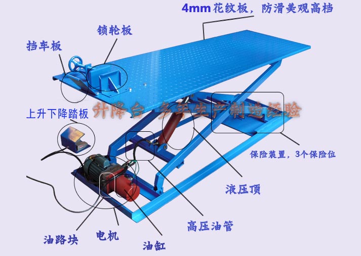 泰誠液壓為你解析升降平臺的結構 泰誠液壓 壓套機知識 首先大家在使用升降平臺前,一定要先了解升降平臺的安全操作規程 下面總結的六點: 一、應安排專人操作,嚴禁超載; 二、在升降機作業范圍內,不得有架設的各類電線、伸出的樹枝等障礙物; 三、一定要把貨物(含手推車、叉車)放穩或鎖定后方可升降,以防升降過程中出現滑動。 四、裝貨時不允許攀登、站立或懸掛在平臺的護欄作業。 五、作為貨梯使用時,嚴禁載人升降。 六、 升降速度,每分鐘4-6米 升降平臺的結構: 2016年4月8日
